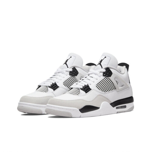 Air Jordan 4 Retro Military Black ShoesBlack, White, GrayFront lace-up fasteningFlat rubber soleLeatherAir Jordan 4 Retro Military BlackMen’s AJ4White, GrayDescriptionJordan Brand decided to bring back one of the original colorways of the Air Jordan 4, the Military Black.They took their popular color-blocked style from the Air Jordan 4 Military Blue and added a smooth white leather upper with a light gray Durabuck toe wrap and netted TPU inserts. The contrast of the military black eyelets, heel tabs, and underlays against the upper is truly eye-catching. At the base, a white, black, and light gray sole with a visible Air unit completes the design. Features:Color: White, Black, GrayKeywords: Air Jordans, Air Jordan 4